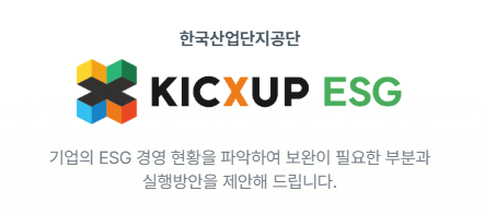 ‘KICxUP ESG’는 국내 중소기업의 ESG 경영 도입을 지원하기 위해 한국산업단지공단이 지원하는 ESG 자가진단 서비스입니다.